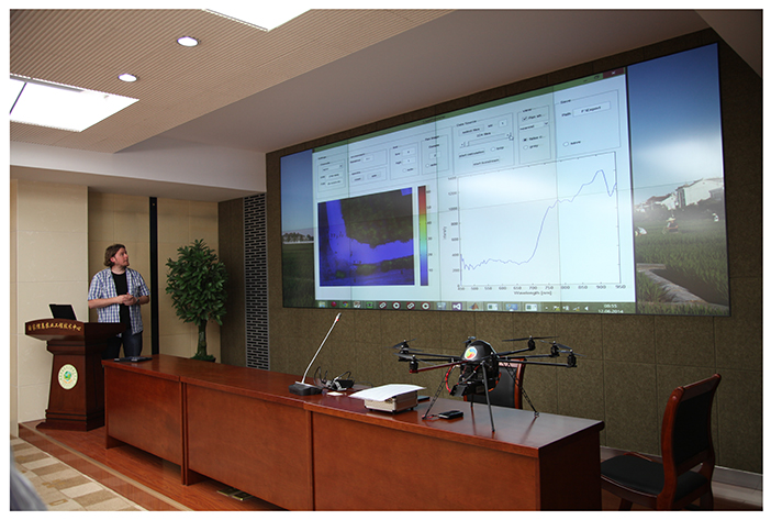 總經(jīng)理邀請到南京農(nóng)業(yè)大學(xué)程教授主持報告會,Michels博士詳細介紹了UHD185的原理、參數(shù)、優(yōu)勢,并結(jié)合UHD185的光譜高分辨率及470g超輕重量等優(yōu)勢與本公司蜘蛛雀八旋翼無人機懸停穩(wěn)定、有效載荷2kg等絕對優(yōu)勢進行了應(yīng)用案例展示,總經(jīng)理為到場參會人員進行現(xiàn)場翻譯,并共同為到場參會人員進行答疑及技術(shù)交流。