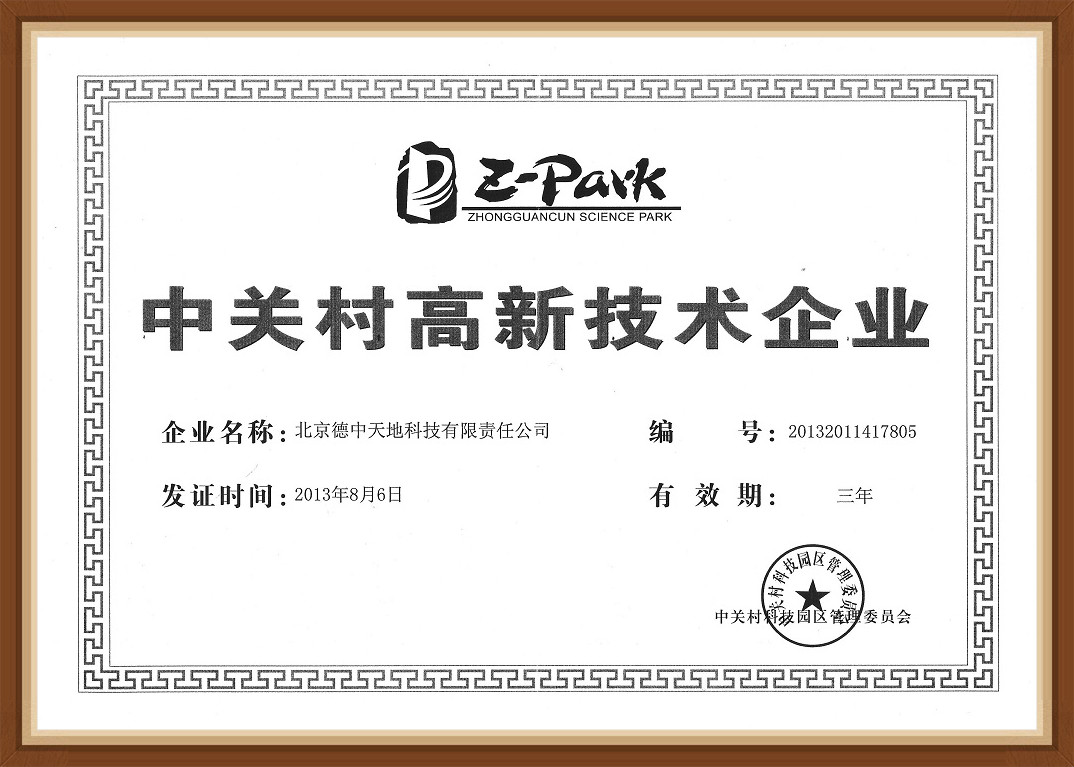 2013年8月北京德中天地科技有限責任公司憑借其世界領先的研發核心技術、先進的航空攝影測量后處理軟件、專業高效的遙感影像處理系統以及自主研發的德中天地蜘蛛雀八旋翼無人機系統設備被中關村科技園區管理委員會認定為中關村高新技術企業,自此公司可以享有國家專項扶持基金和優惠政策。