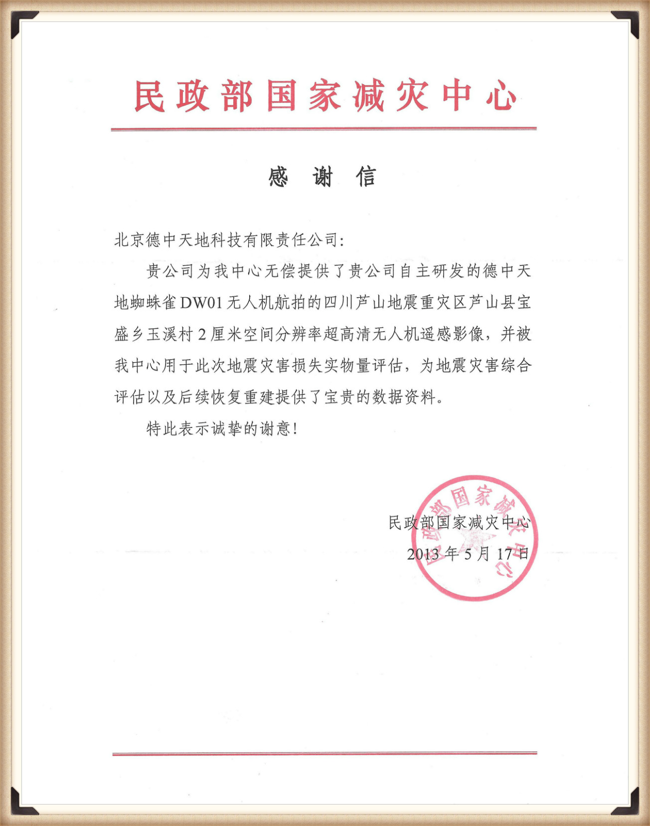 四川蘆山地震發生后,我公司派工作人員第一時間趕到現場協助開展救災工作。其中公司自主研發的德中天地蜘蛛雀DW01無人機航拍的四川蘆山地震重災區蘆山縣寶盛鄉玉溪村2厘米空間分辨率超高清無人機遙感影像用于此次地震災害損失實物量評估,為地震災害綜合評估以及后續恢復重建提供了寶貴的數據資料。民政部國家減災中心特發來感謝信,表示對我公司此次救援工作的認可。