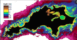 水深數據或水下地形對海上貿易,工業,環境管理和監測等方面是非常重要的。水深測量傳統的方式是通過船上的聲納系統或通過機載激光雷達進行測深,然后將獲取的數據綜合到 DEM 數據集中。對大面積清澈的水體來說,現在的光學遙感方法為量測水深提供了一個替代方案,這個方案更經濟有效。對衛星或機載遙感影像,可以是多光譜衛星數據也可以是高光譜航攝影像,應用精細的處理器可以推導出精確的水下地形,根據所輸入的數據類型,可以生成不同空間分辨率的水深圖。