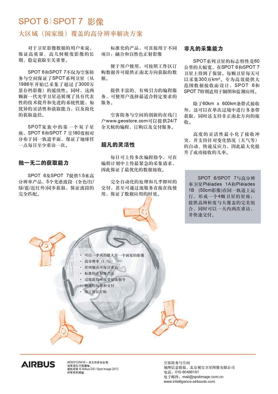 北京德中天地科技有限責任公司為法國AIRBUS公司的中國代理商。AIRBUS的SPOT6-7衛(wèi)星是高分辨率對地觀測衛(wèi)星,分辨率達1.5米,具有60km成像幅寬,能實現(xiàn)地球任何地點的每日重訪,每日采集能力達600萬平方公里,廣泛應用于國防、環(huán)境監(jiān)測等領域。